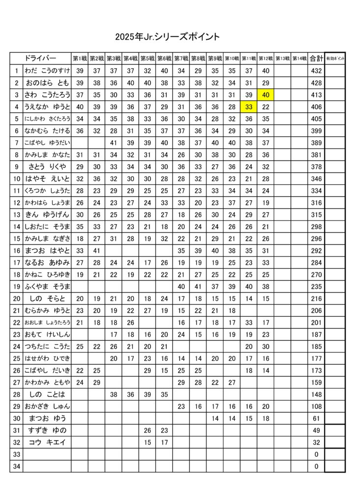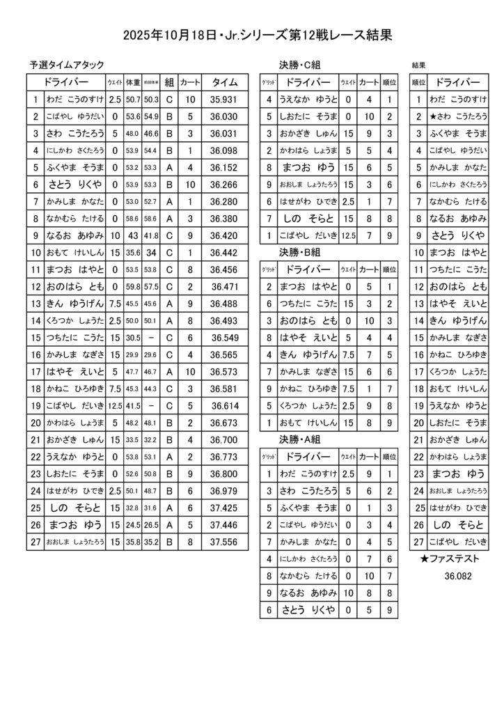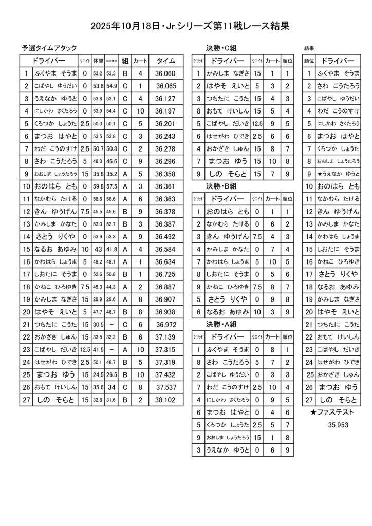 10月19日に開催しました2025年ジュニアシリーズ・スーパージュニアシリーズ第11戦・第12戦の結果です。