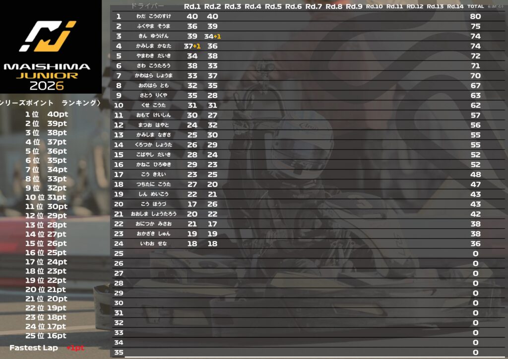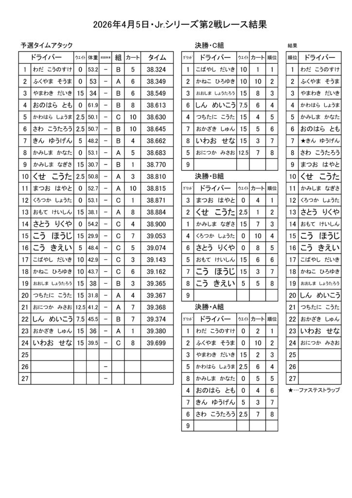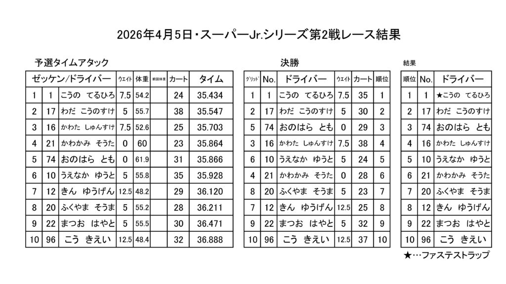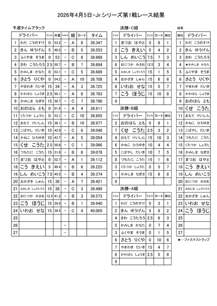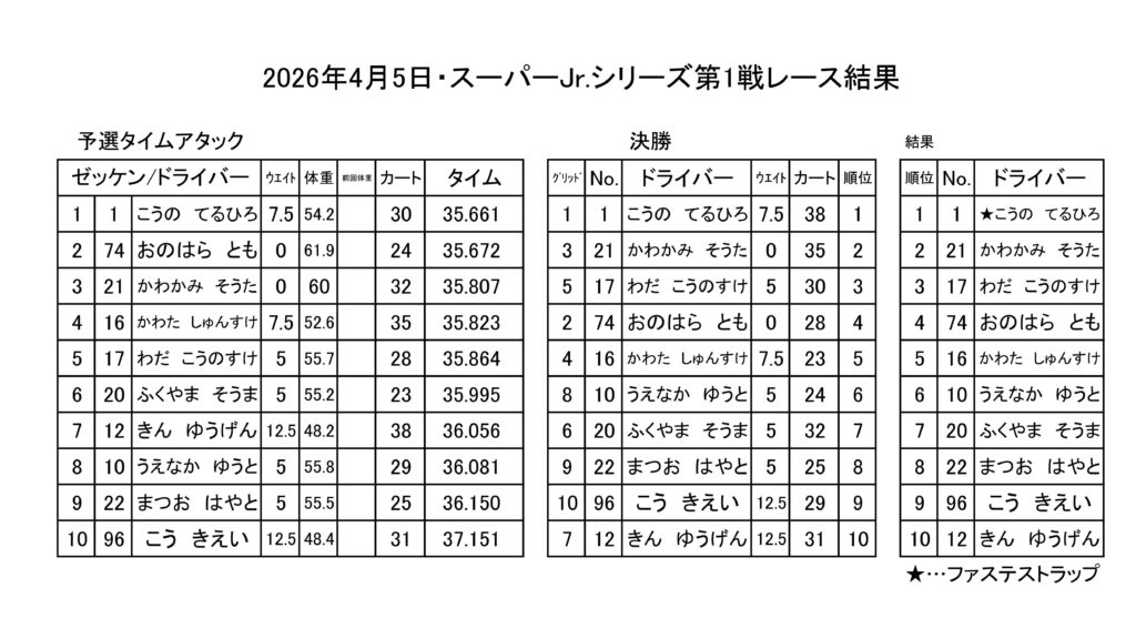 2026/4/5開催「舞洲ジュニア&スーパージュニアシリーズ開幕戦」結果