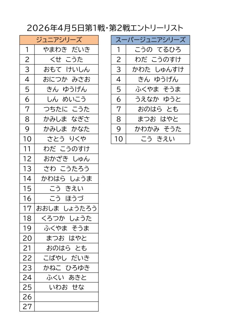 明日開催の「舞洲ジュニア&スーパージュニアシリーズ2026開幕戦」エントリーリストです。